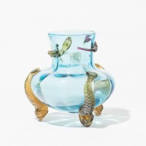 Verre bleu à décor appliqué de lézards et dauphins, H 19 cm
