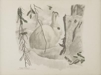 Lapin des neiges, gravure sur bois, signée et datée 1943, 28x39...