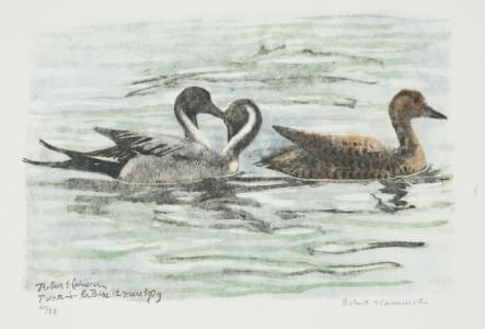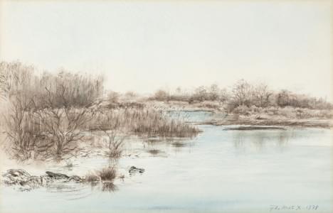 Canard dans les roseaux, fusain, pastel et aquarelle sur papier,...