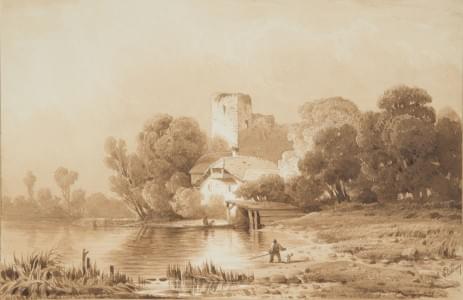 Paysage lacustre avec tour carrée, lavis d'encre signé, 17x27 cm