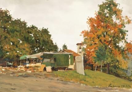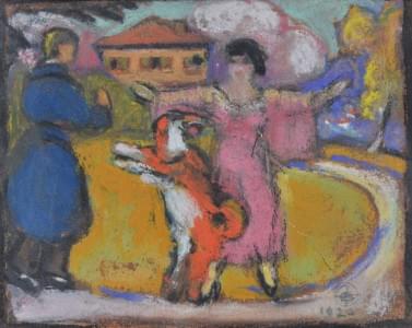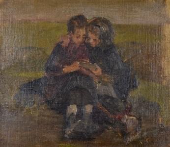 Lecture à la campagne, huile sur carton, non signée; 18x20cm.