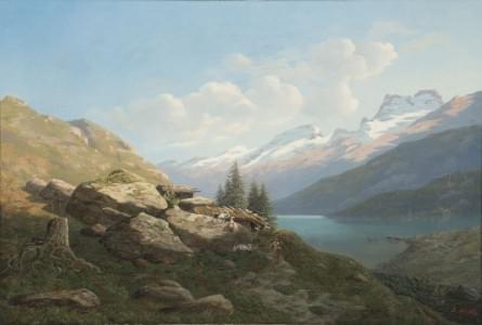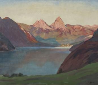 Vue sur le lac et montagnes au soleil couchant, huile sur toile...