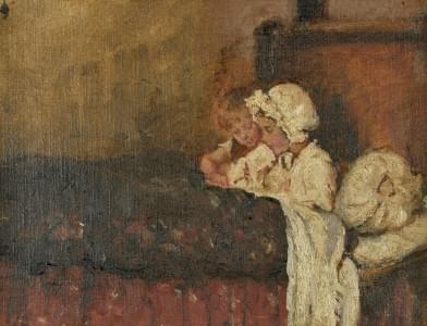 Enfants au lit, huile sur toile signée en bas à droite; 20x27cm