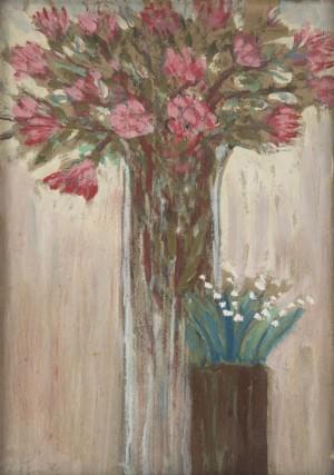 Bouquet de fleurs roses et bouquet de muguet, huile sur carton m...