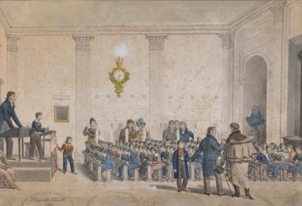 Salle de classe sous la Restauration, dessin à l'encre, aquarell...