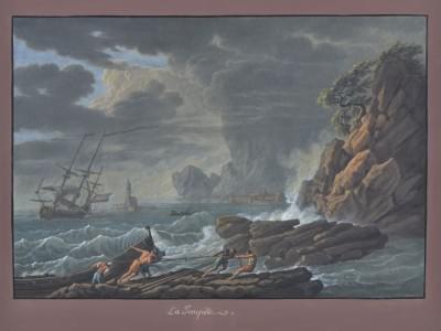 La tempête et Le naufrage, paire de gravures rehaussées, signées...