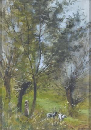 Fillette et moutons dans un paysage boisé, aquarelle sur papier,...