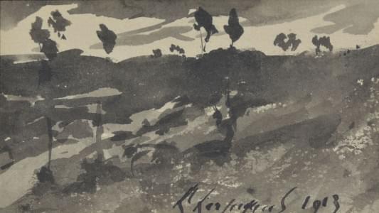 Paysage de lac, 1909, lavis à l'encre brune sur papier, non sign...