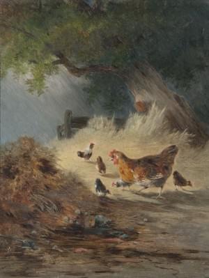 Basse-cour, huile sur panneau, signée, 26x21 cm
