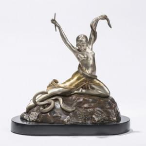 Charmeuse de serpent, bronze à patine argenté et médaille, signa...