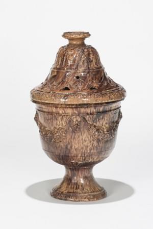Terre cuite émaillée à marbrures ocres à décor en relief de guir...