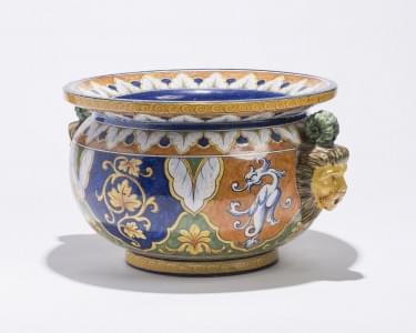 Faïence émaillée polychrome à décor de mascarons et arabesques,...