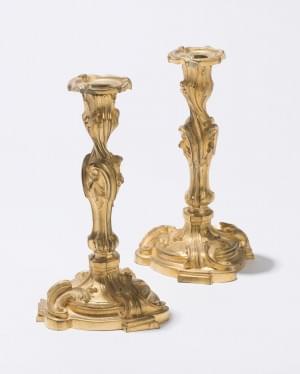 Paire de flambeaux, bronze doré à riche décor rocaille, D 14 cm