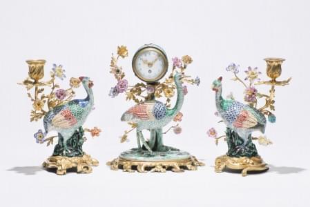 493. Garniture de cheminée par Samson comprenant une pendule et deux...