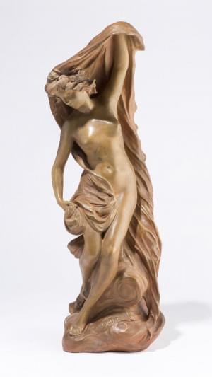 L'hiver, terre cuite à patine brune, socle en bois sculpté et do...