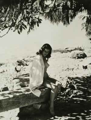 Jeune femme assise au bord de l'eau, tirage argentique en sépia,...