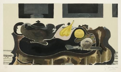Nature morte à la théière et aux fruits, lithographie en couleur...
