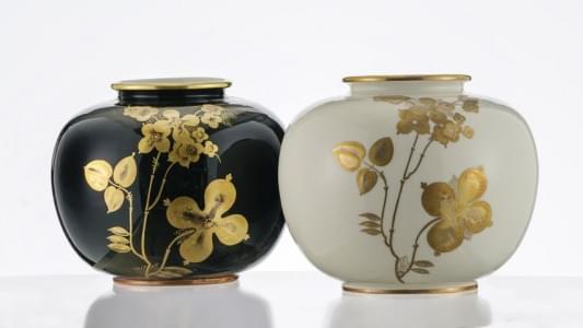 Porcelaine à décor de tiges fleuries dorées, l'un sur fond ivoir...