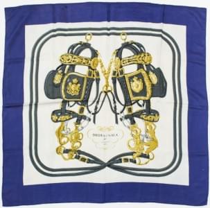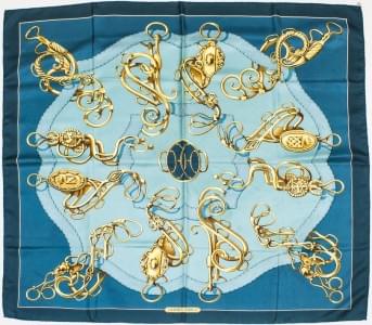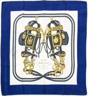 Carré en soie à décor d'éléments équestres sur fond crème et ble...