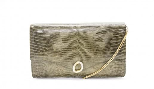 Cuir de lézard vert, garniture en métal doré, bandoulière à mail...