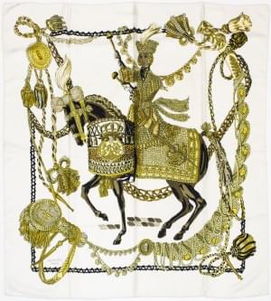 3027. Hermès, foulard à motif de cavalier doré sur fond crème