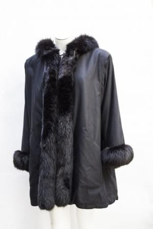3031. Nina Ricci, pelisse noire à capuche bordée de fourrure