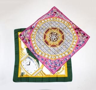 Un foulard à décor de montres sur fond vert, soie, 88x86 cm, un...