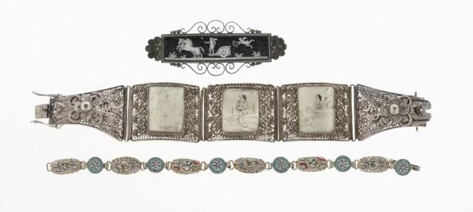 3096. Lot de deux bracelets, l'un serti de trois scènes japonaises pei...