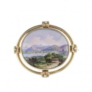 3153. Broche sertie d'une vue du Mont Blanc depuis Pregny à l'émail su...