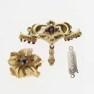 3155. Lot de trois fermoirs dont l'un serti de rubis et l'un serti de...
