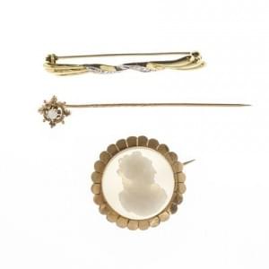 3195. Lot de deux broches et d'une épingle à cravate, une sertie d'un...
