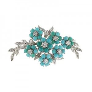 3213. Broche à motif de fleurs serties de diamants et turquoises