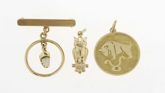 3225. Lot comprenant un pendentif hibou, une médaille du signe du taur...