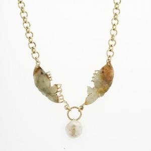 3272. Collier serti de deux poissons en jadéite retenant une perle bar...
