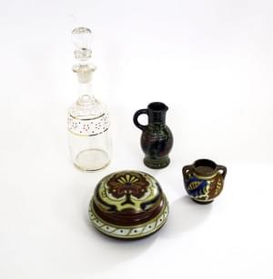 3288. Une boîte, un pichet, un petit vase et un flacon à décor Art Nou...
