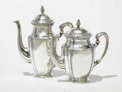 Métal argenté et bois exotique, comprenant: théière, cafetière,...