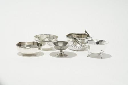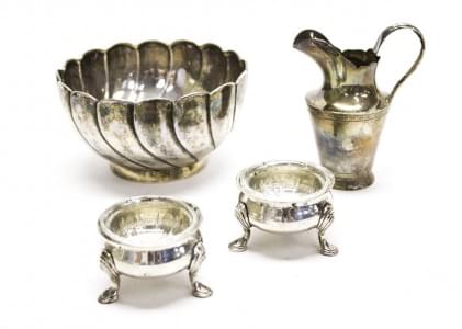 3443. Paire de salerons, bol à festons torses et crémier style vieux L...