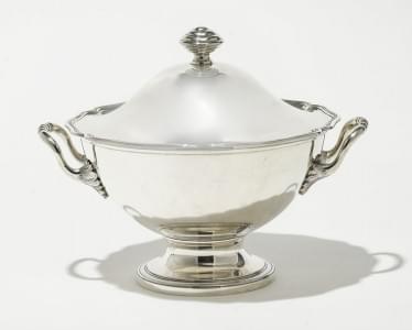3458. Légumier rond à bordure de ruban croisé et prise pomme de pin