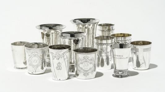 comprenant: timbale, coquetier, lien de serviette et deux cuillè...