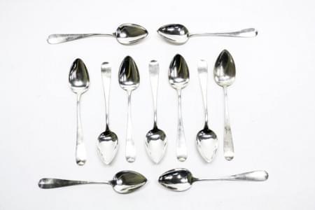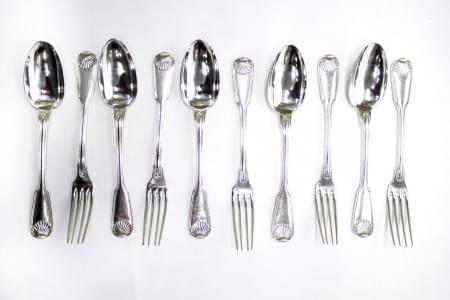 3461. Puiforcat, cinq fourchettes et cinq cuillères à motif de coquil...