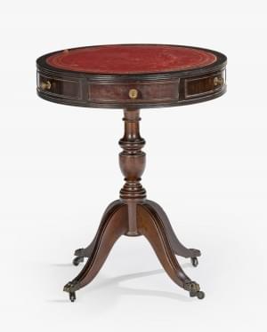 Deux tiroirs, roulettes, bois teinté façon acajou, cuir rouge, 6...