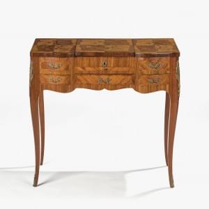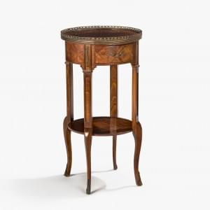 Deux tiroirs, une tablette, bois de placage marqueté de fleurs,...