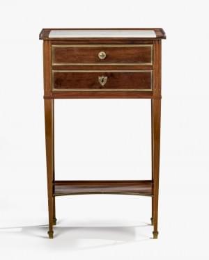 Deux tiroirs, acajou, filets de laiton et marbre blanc, 74x43x22...