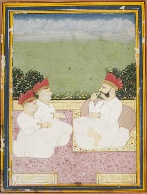 426. Trois personnages s'entretenant, Inde, Rajasthan, école de Mewar...