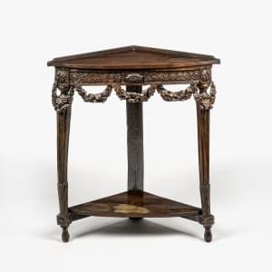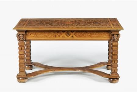 Plateau marqueté de rinceaux, pieds ornés de mascarons, bois fru...
