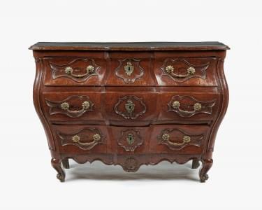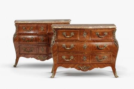 Trois tiroirs sur deux rangs, bois de placage, bronze doré et ma...