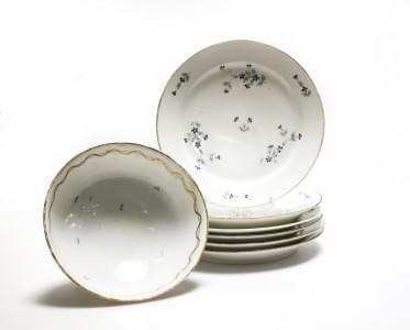 3244. 6 assiettes à décor de semis de bleuets et 1 jatte à décor de gu...
