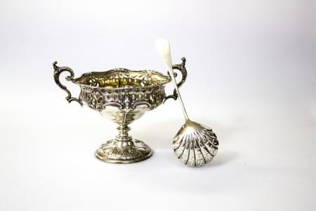 3299. Sucrier à anse sur piédouche gravé d'entrelacs d'époque victorie...