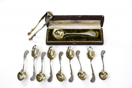 Argent et vermeil, France, 25g. 9 cuillères et pince à sucre à m...