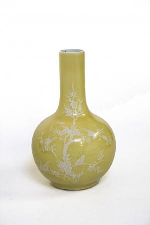 Porcelaine émaillée jaune à décor blanc d'oiseaux et cerisiers e...